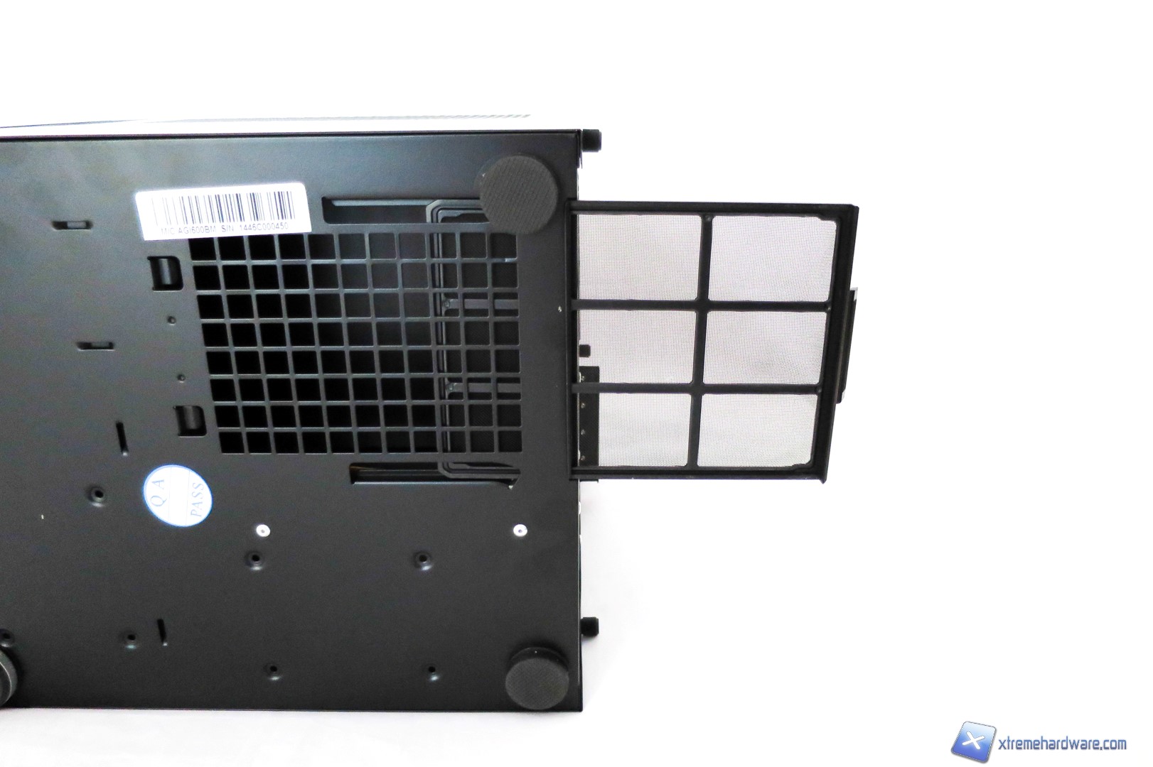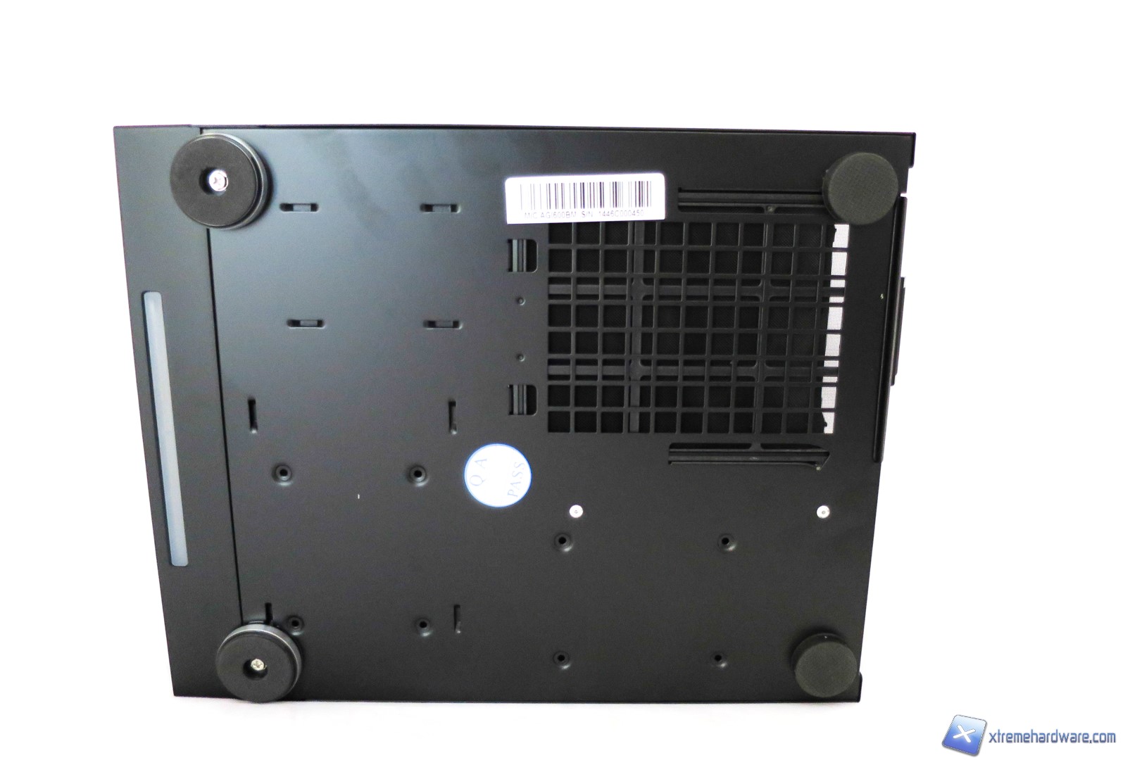 Capovolgendo il case troviamo un layout quasi classico. Oltrea i classici piedini di cui due (i frontali) svitabili e caratterizzati da una fascia simil metallo, troviamo il filtro antipolvere in corrispondenza della ventola dell’alimentatore, i fori per installare due drive da 2,5” nel fondo del case ed infine una barra trasparente, lato sinistro, con superficie opaca da cui verrà irradiata la luce del LED blu di cui vi abbiamo accennato in precedenza.