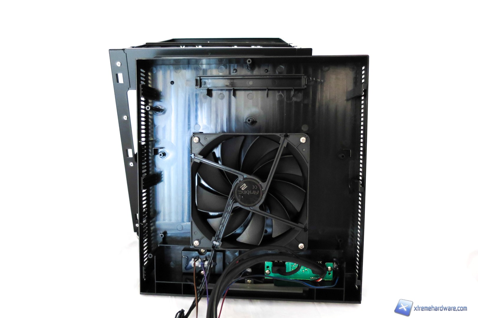 Arriviamo ora al retro del case che adotta un layout quasi classico. Il foro per l’alimentatore è posto in posizione inferiore; al suo fianco trovano posto sia una griglia per una ventole opzionale da 80mm sia il cage per unità da 3,5” (fino a tre). A salire troviamo il foro per l’I/O Shield della scheda madre e i relativi quattro slot per schede PCIe. Non mancano i passatubi con rivestimento in gomma ed una griglia con una ventola da 120mm pre-installata. Ricordiamo che l’Antec ISK600M permette un adeguato spazio di installazione grazie ad una struttura bicamera orizzontale.