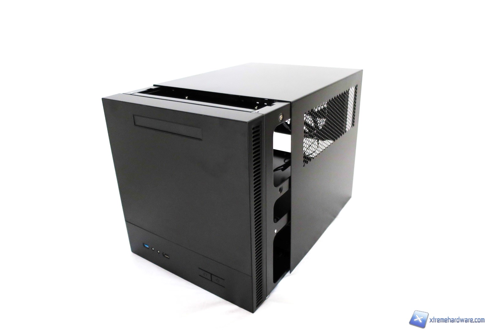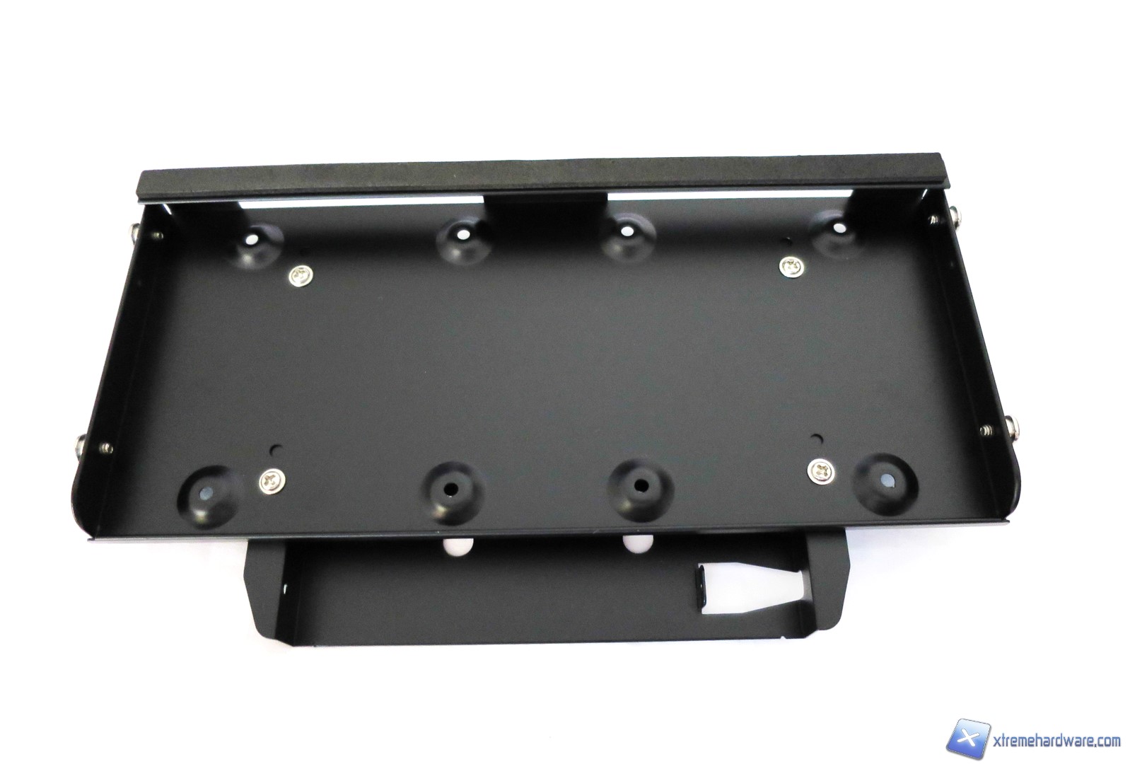 Il tray è già dotato di stand-off per l’installazione di una madre Mini-ITX. Per il formato mATX è richiesta l’installazione di due ulteriori standoffs inclusi nel bundle. Da notare anche come la struttura superiore del case sia dotata di un supporto/tray amovibile tramite delle slitte laterali. Tale supporto ci darà la possibilità di installare l’unità ottica slim e due SSD.