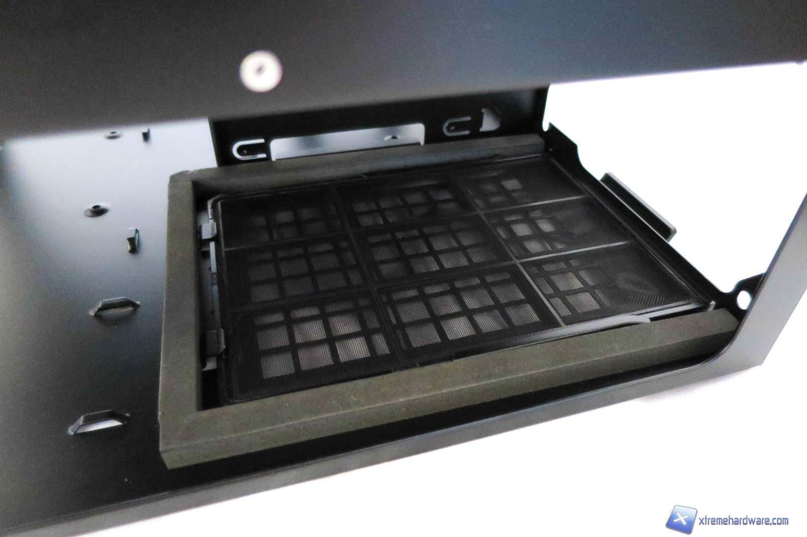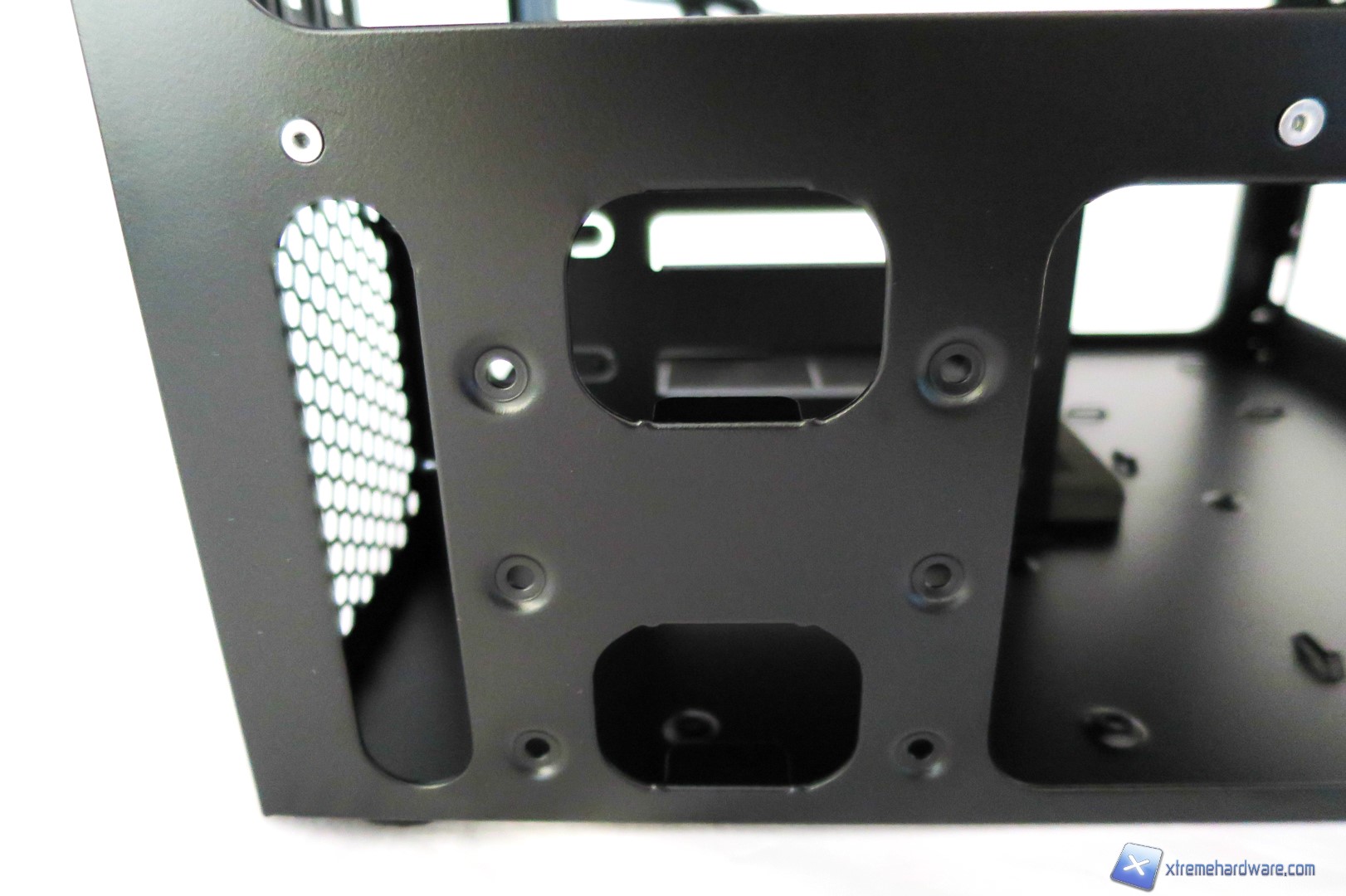 Torniamo ora alla struttura principale del case e lo facciamo da una angolazione frontale. Come vediamo la struttura non è uniforme ed è caratterizzati da fori di forma quadrata ed una rientranza. I fori serviranno a convogliare l’aria generata dalla ventola da 140mm frontale mentre la rientranza ad effettuare un cablaggio adeguato. Interessante anche come tali fori siano presenti in maggior quantità nel lato centrale e destro mentre nel lato sinistro vi sia la totale assenza. Scelta oculata ricordando che tale lato è adibito all’installazione di schede video: leschede più lunghe potrebbero interferire con i fori complicando il cablaggio. Con tale scelta potremo agire meglio nell’installazione di schede video o di espansione, per le quali è opportuno ricordare la tolleranza massima di 317,5mm.