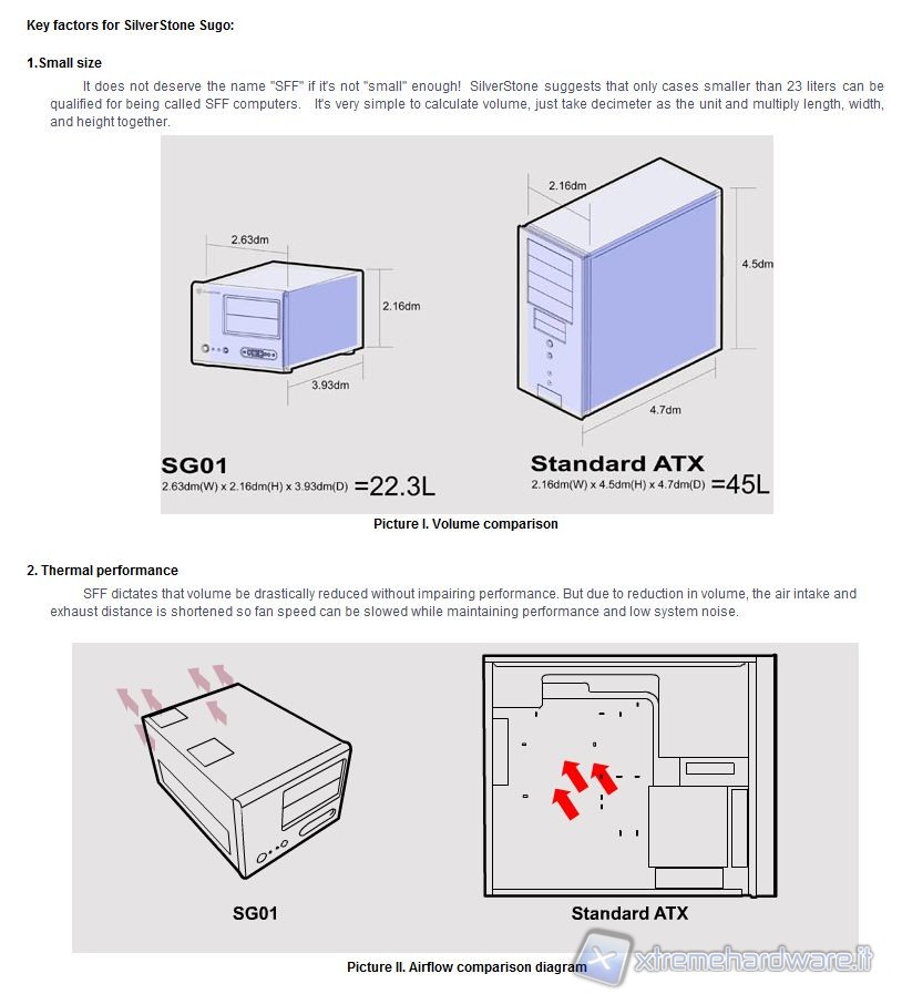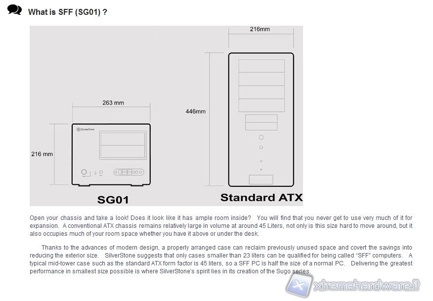 Grazie ai progressi dei design più avanzati e moderni, se viene adoperato un cabinet che sfrutta adeguatamente gli alloggi interni, è possibile recuperare molto dello spazio precedentemente nascosto ed inutilizzato, al fine di ridurre la dimensione complessiva. SilverStone suggerisce che solo i cabinet più piccoli di 23 litri possono essere qualificati per essere chiamati SFF. Un pc SFF è la metà delle dimensioni di un normale PC con cabinet avente un form-factor ATX e struttura tower. Fornire il massimo delle prestazioni nello spazio più piccolo possibile, è proprio dove risiede lo spirito SilverStone, nella creazione della serie Sugo.