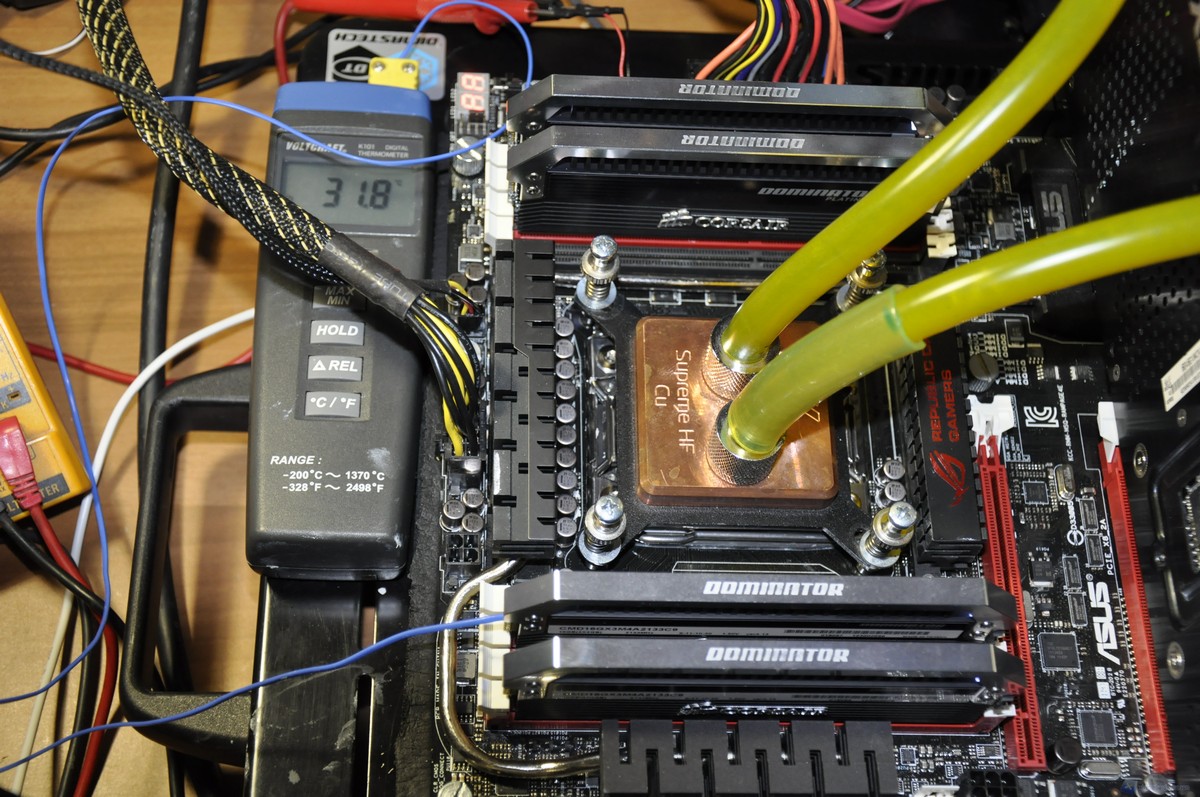 Su RAMPAGE IV EXTREME con una temperatura ambiente di circa 27° ed un overvolt di 0,156v, abbiamo rilevato sotto test con un termometro digitale della VOLTCRAFT K101 una temperatura massima di lavoro di 31,8°. Merito dell’ottimo e brevettato sistema di raffreddamento DHX che da generazioni caratterizza la serie Dominator, nonché dei nuovi chip a 30nm.