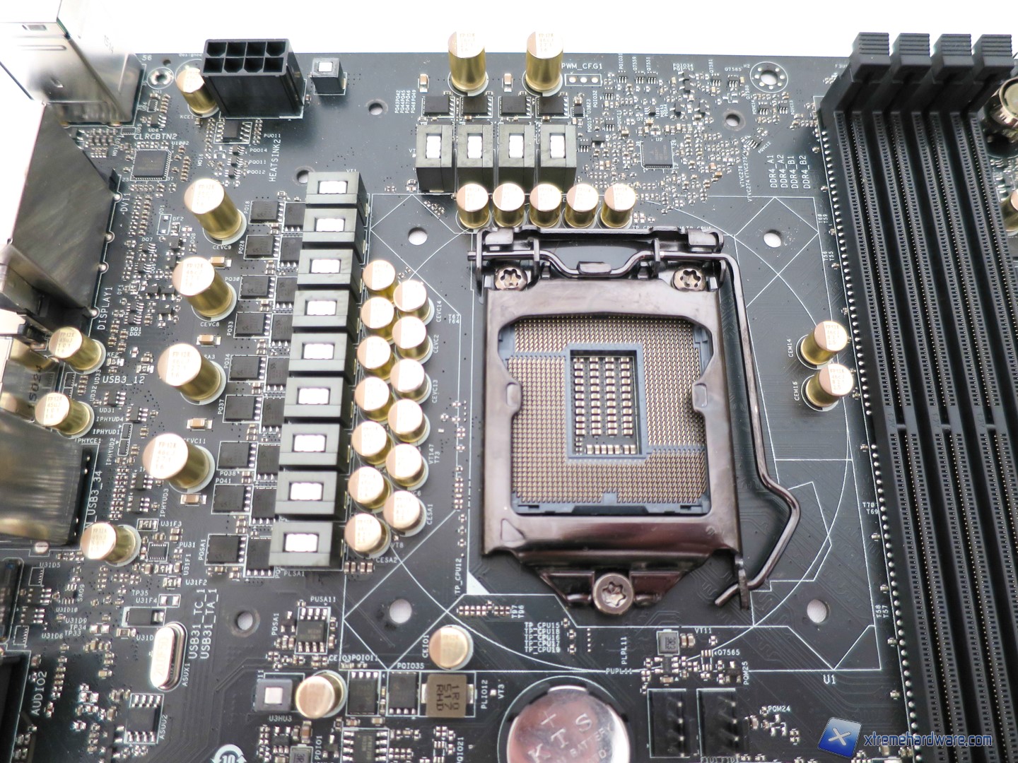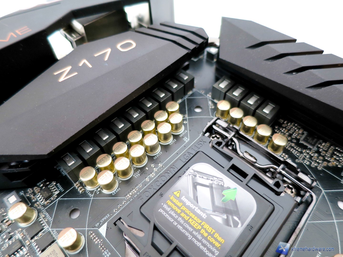 Iniziamo ora a dare uno sguardo alla zona socket dove possiamo ammirare meglio il look elegante e la dotazione di ben 12 fasi di alimentazione. Contiamo in realtà 13 induttanze intorno al socket, abbiamo infatti 8 fasi dedicate alla CPU, 4 alla GPU e una per il System Agent. Ovviamente altre fasi sono dedicate al comparto RAM che permetterà infatti di gestire frequenze fino a 3866MHz e più a seconda dei moduli installati.  Come notiamo, oltre alle induttanze da 60A, troviamo anche i condensatori Nichicon garantiti per 12000 ore che aiuteranno la gestione del voltaggio erogato nel migliore dei modi. Osserviamo anche la forma squadrata degli heatsink in alluminio e della relativa heat pipe che li unisce in un solo blocco visivo e fisico. Quest’ultima ovviamente aiuterà il trasferimento del calore da entrambi gli heatsink e la sua presenza è decisamente gradita, nonostante i consumi ridotti di Skylake. Troviamo inoltre la scritta del nuovo chipset sull’heatsink di sinistra.