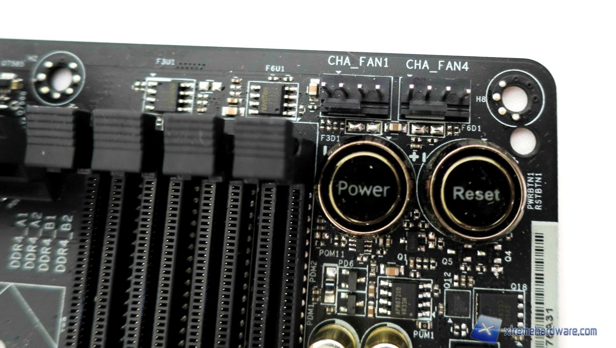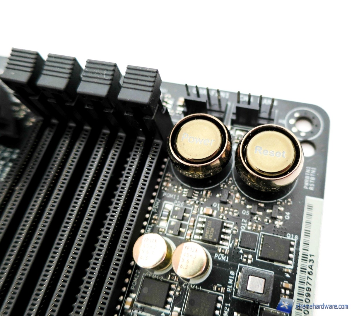 Nella parte superiore agli slot troviamo due tasti Power e Reset che potranno essere sfruttati per utilizzare la scheda madre  su un banchetto.