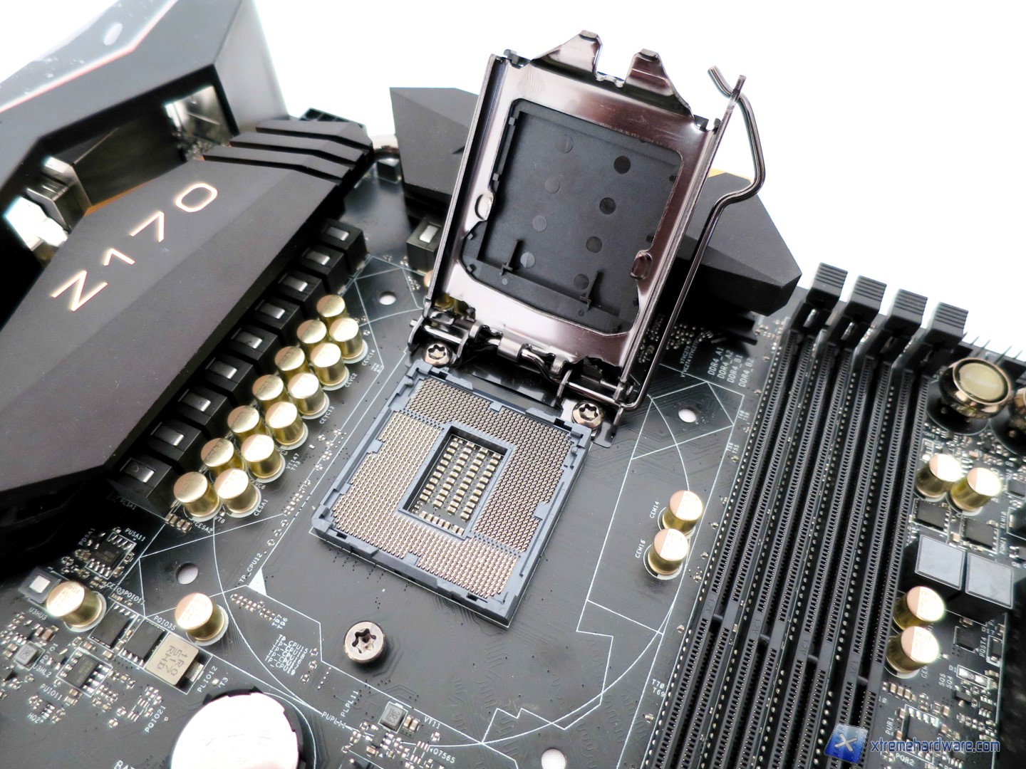 Alzata la levetta di ritenzione del socket, possiamo osservare meglio il nuovo socket LGA1151 che ospiterà i nuovi processori a 14nm Skylake.