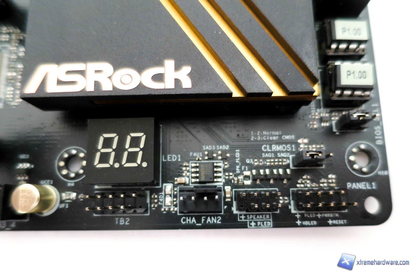 Proseguendo troviamo nella zona inferiore della scheda madre un Debug LED che riporterà un codice di errore alfanumerico in caso di errori. Troviamo anche i classici header per il power, reset del case oltre che quelli USB, Audio ed ulteriori connettori per ventole.
