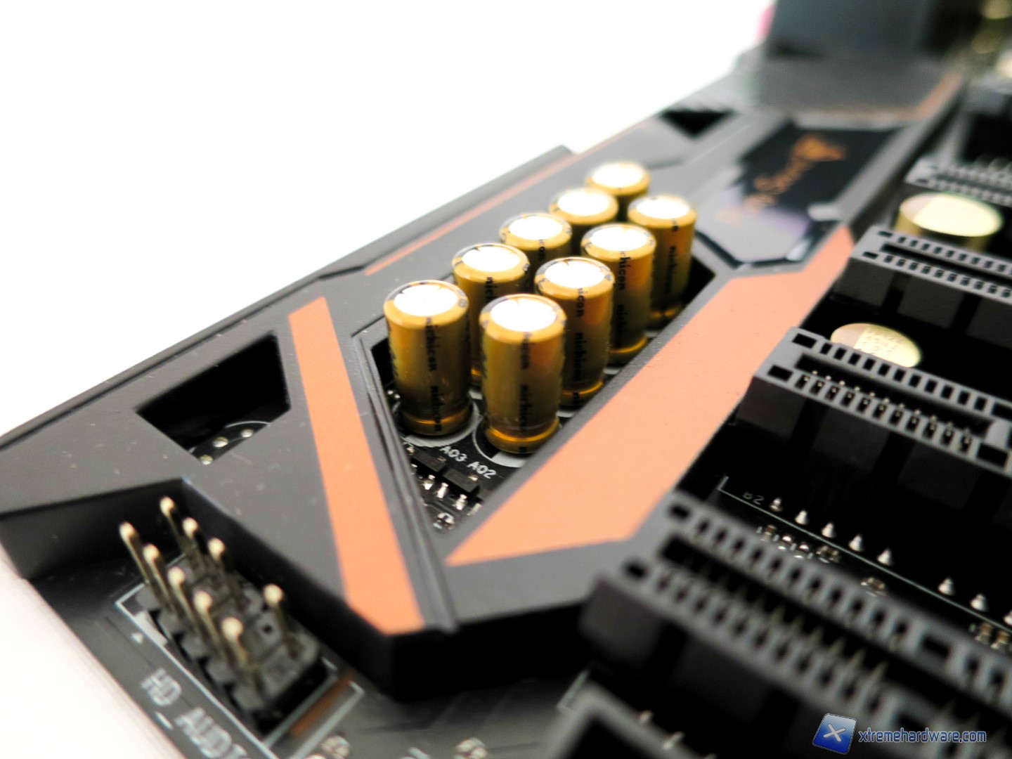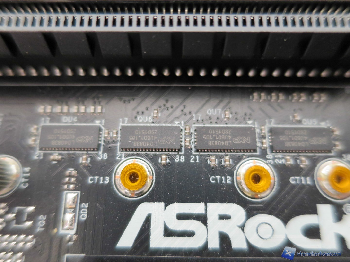 Scrutando tra gli slot PCI-Express troviamo anche degli switch NXP L04083B che gestiranno in maniera ottimizzata la banda passante tra gli slot PCI-Express. Inoltre questi switch gestiranno anche la banda nel caso in cui si dovesse connettere un SSD M.2, attingendo dalle porte SATA Express (che non potremo quindi utilizzare neanche come porte SATA).