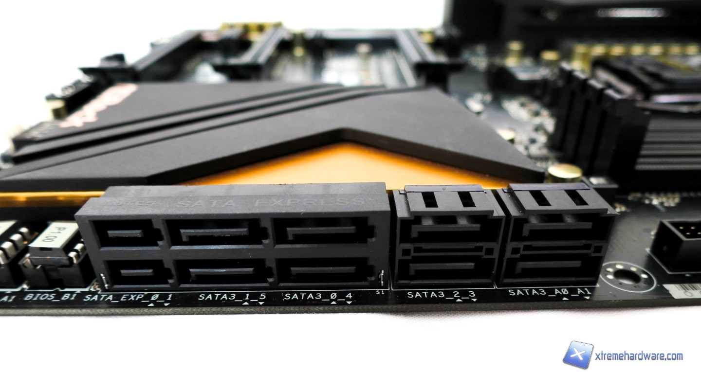 A lato dell’heatsink e dei due chip BIOS, troviamo il comparto Storage della Extreme6 che in questo caso si compone di 8 porte SATA III e 2 porte SATA Express. Dotazione valida e funzionale. Le prime due porte SATA sono gestite da un chip/controller ASMedia ASM1061, mentre le altre sono direttamente collegate al chipset Z170 e supportano RAID 0,1 e 5 e 10.