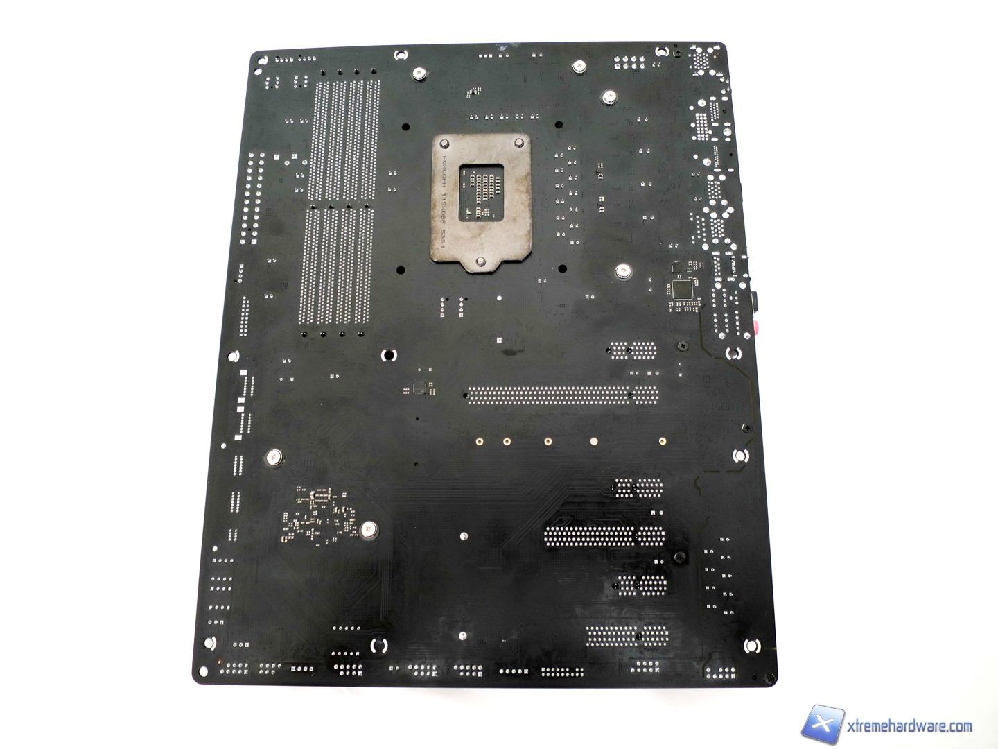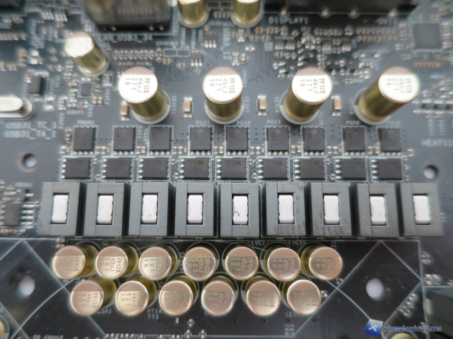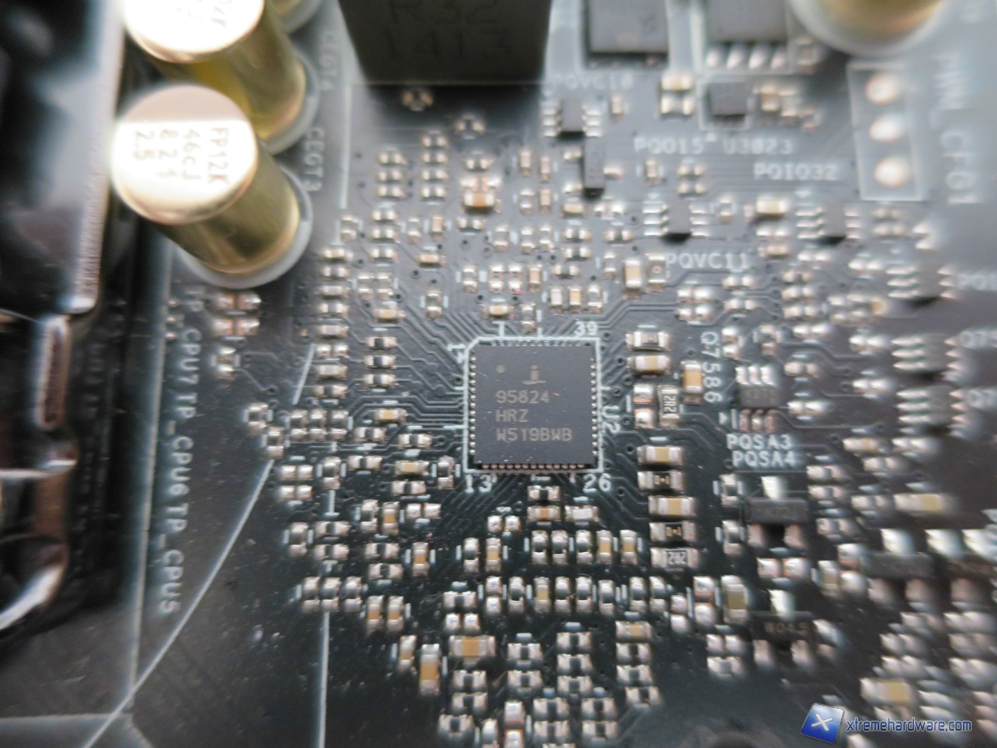 Abbiamo proceduto anche a rimuovere i due heatsink tenuti in sede da delle viti con molle di ritenzione. Operazione veloce e semplice ma da eseguire sempre con cautela e calma. Una volta rimossi o rimosso visto il singolo blocco gli heatsink possiamo osservare meglio le fasi impiegate da ASRock per la Extreme6. Dunque troviamo 12 fasi per la gestione dell’alimentazione della CPU gestite da un controller Intersil PWM siglato ISL95824. Questo controller digitale ibrido è predisposto per gestire 4+3 fasi: 4 canali sono utilizzati per gestire la 8 fasi della CPU (con phase doubler), mentre gli altri due sono dedicate alla gestione di GPU VCCSA e VCCIO.
