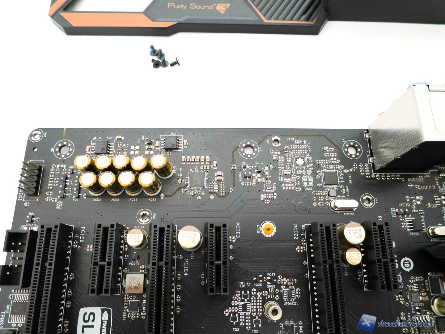 Arrivando nell’angolo sinistro dove era presente anche il connettore HD Audio troviamo come visto prima la Shield che coprirà il circuito audio, diviso dal resto del PCB per ridurre al minimo interferenze elettromagnetiche. In tale zona troviamo non solo ulteriori condensatori Nichicon adibiti al comparto audio ma anche il chip Realtek ALC1150 che si occuperà di gestire tutte le funzioni audio offerte dalla Extreme6 come Audio 7.1, Supporto DTS e molto altro. ASRock Purity Sound 3 è il nome dato da ASRock per il sistema offerto da questa Z170. Il sistema Purity Sound 3 offre un SNR di 115dB ed un’impedenza fino a 600Ohm grazie ad un chip TI NE5532 che fungerà da amplificatore.