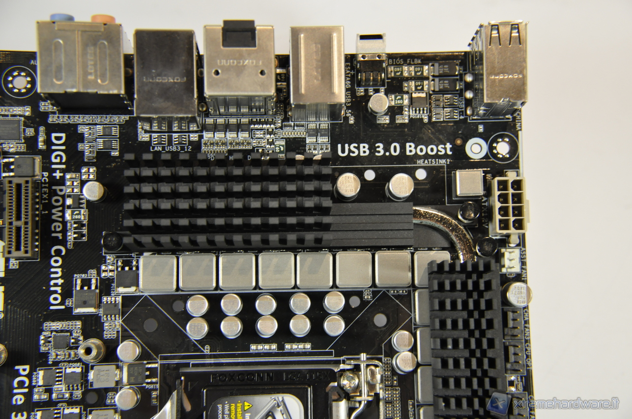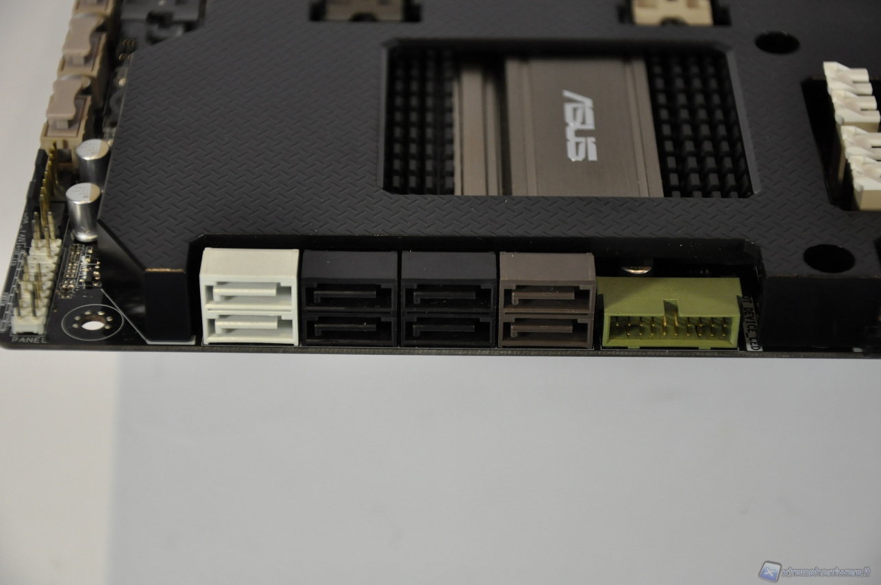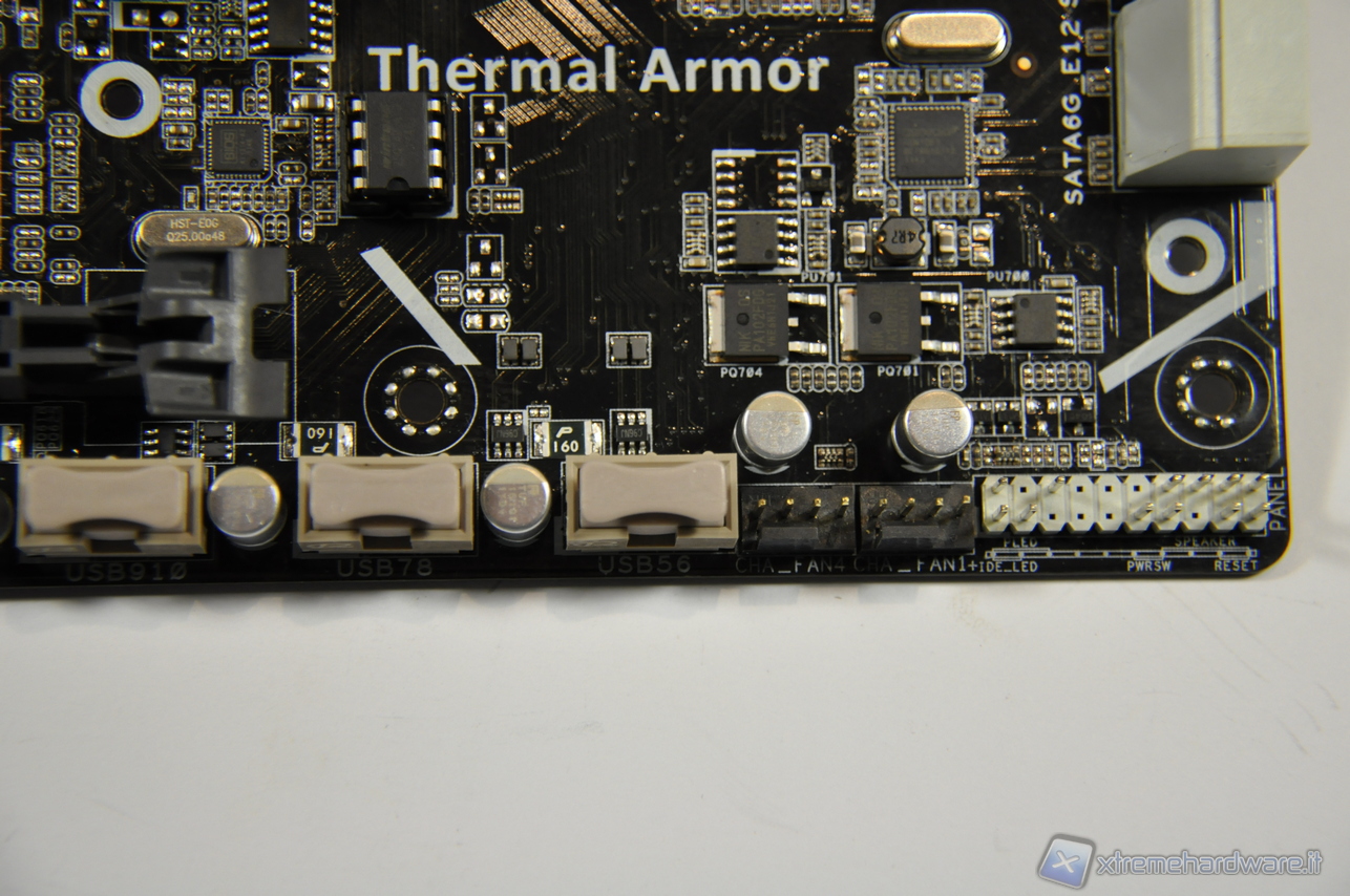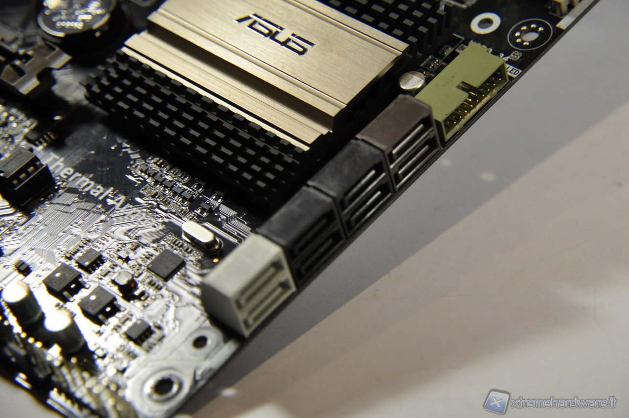 Partendo dal lato destro della motherboard troviamo le 8 porte SATA di cui, tranne le 4 nere compatibili con lo standard precedente SATA2 3Gbps, le restanti 4 SATA3 6Gbps sono suddivise tra le 2 bianche, native e più veloci in quanto collegate al chipset Z77, e da altre in grigio controllate dal chip supplementare ASM1061, che serve anche le 2 porte eSATA3 (rosse) presenti nel pannello posteriore delle connessioni.