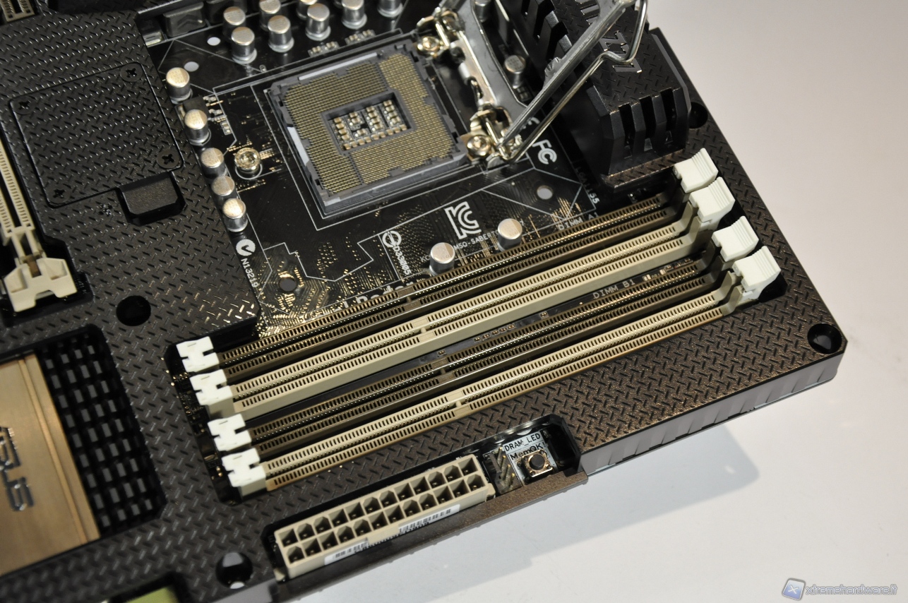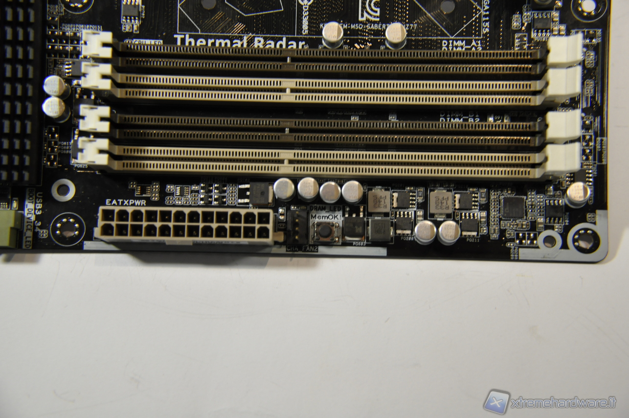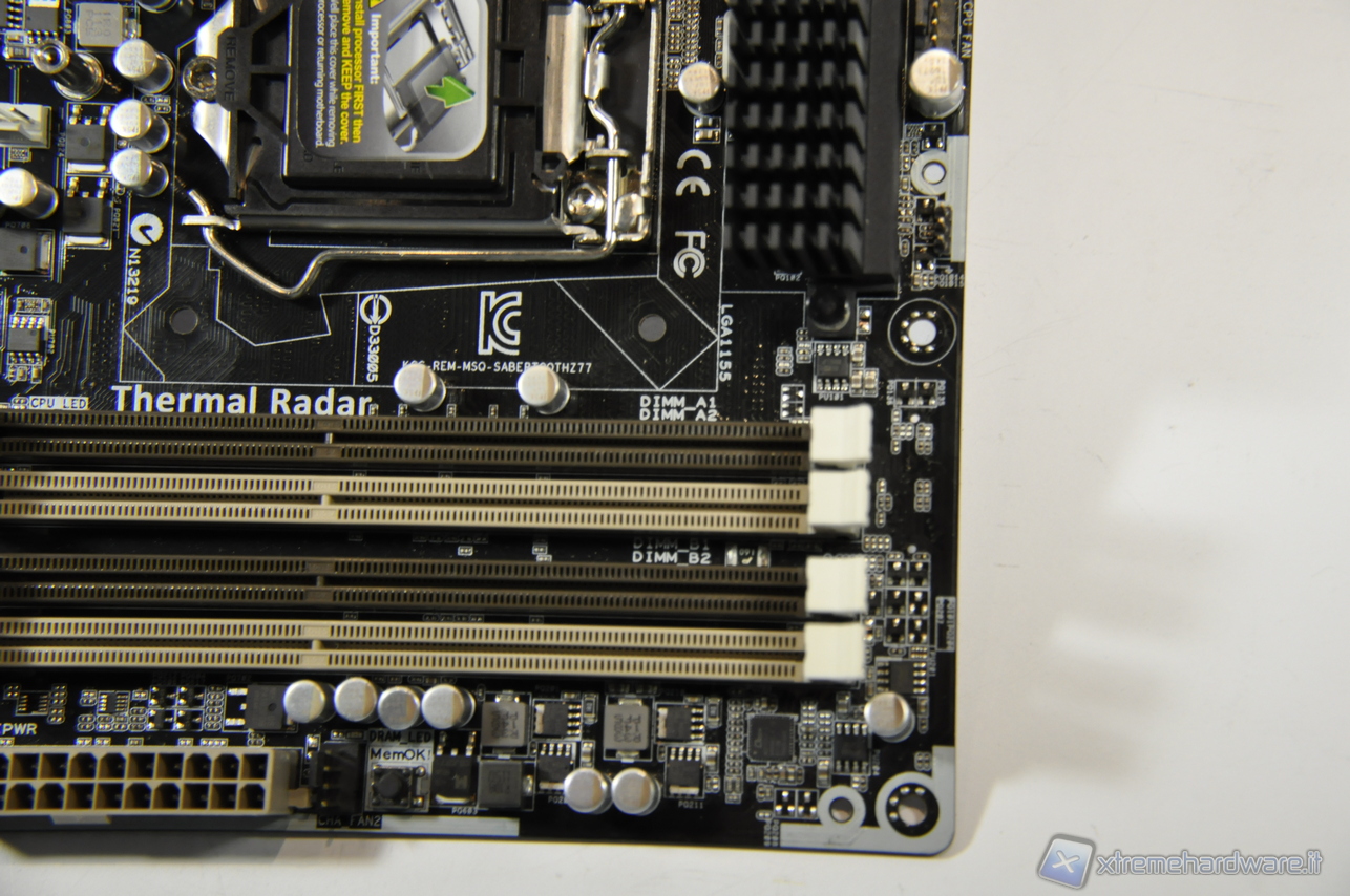 Alla base vediamo il classico connettore di alimentazione a 24 pin E-ATX mentre alla sua destra oltre ad un connettore a 4-pin dedicato all’alimentazione di una ventola, troviamo il pulsante MemOK per il test della memoria all’avvio o per risolvere eventuali boot dovuti ad incompatibilità dei moduli RAM DDR3 con la Sabertooth Z77. Per finire i 4 slot compatibili con i moduli RAM di tipo DDR3 suddivisi per colore e quindi per tecnologia Dual Channel.