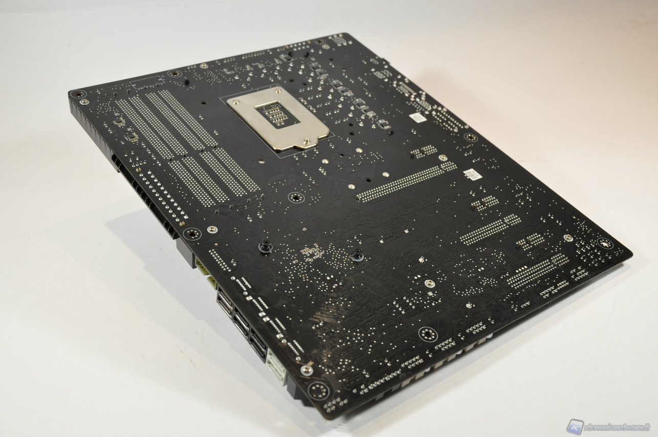 Ruotando la scheda, nella parte posteriore del PCB, notiamo che gli ultimi due connettori PCI-E x16 hanno connessioni elettriche per modalità x8.