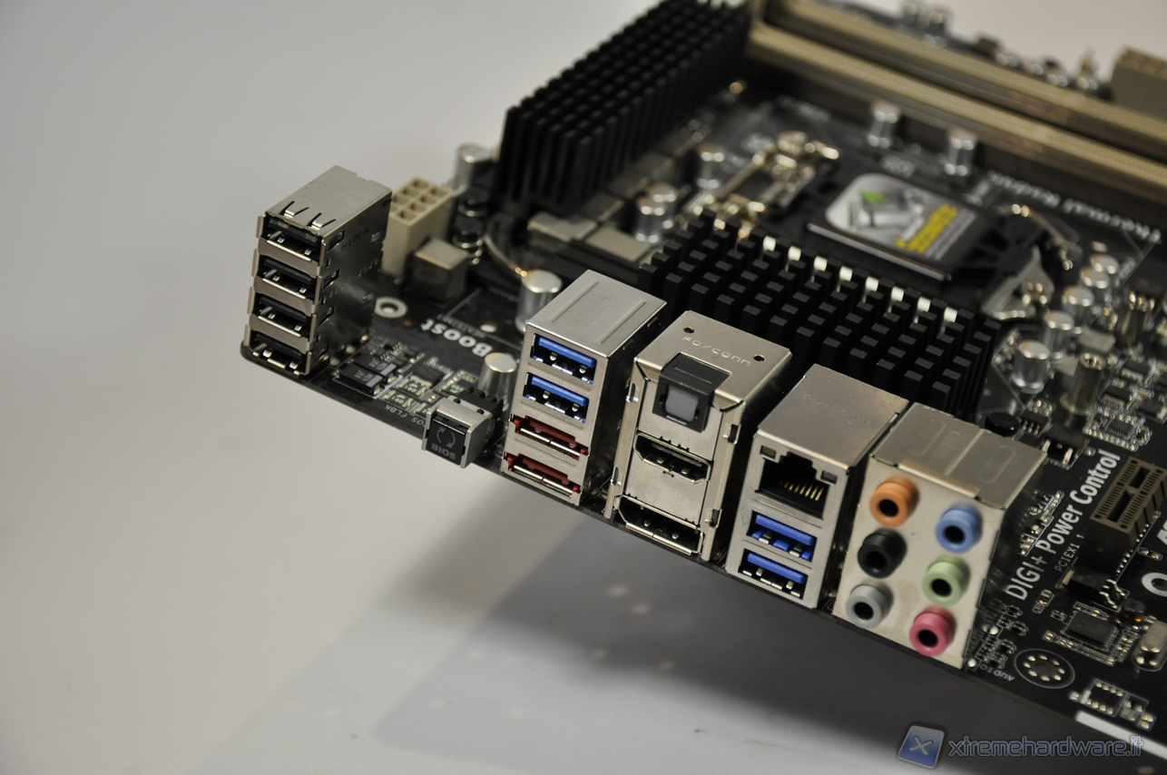 Ecco una foto di profilo che esalta a livello estetico la scocca della scheda e mostra l’insieme delle porte I/O. Partendo da sinistra il primo blocco raggruppa 4 porte USB2.0. A seguire il pulsante per lo switch del BIOS seguito dal blocco di 2 porte (blu) USB3.0 e di 2 porte eSATA3 6Gb/s (rosse) servite dal controller supplementare ASM1061. A seguire un’uscita Optical S/PDIF e due connettori video rappresentati dalla porta HDMI e DisplayPort. Ancora un altro blocco con altre 2 porte USB3 ed un attacco Ethernet RJ45 in standard Gigabit. Per finire il gruppo di connettori Jack per la portabilità del segnale audio in uscita ed in ingresso servite dal chip Realtek ALC892 con supporto ad 8 canali (7.1) High Definition Audio CODEC. Il chip Realtek garantisce la piena compatibilità con la tecnologia Blu-Ray Audio Layer Content Protection ed una purezza del suono con Absolute Pitch 192 KHz / 24-bit True BD  Lossless Sound.