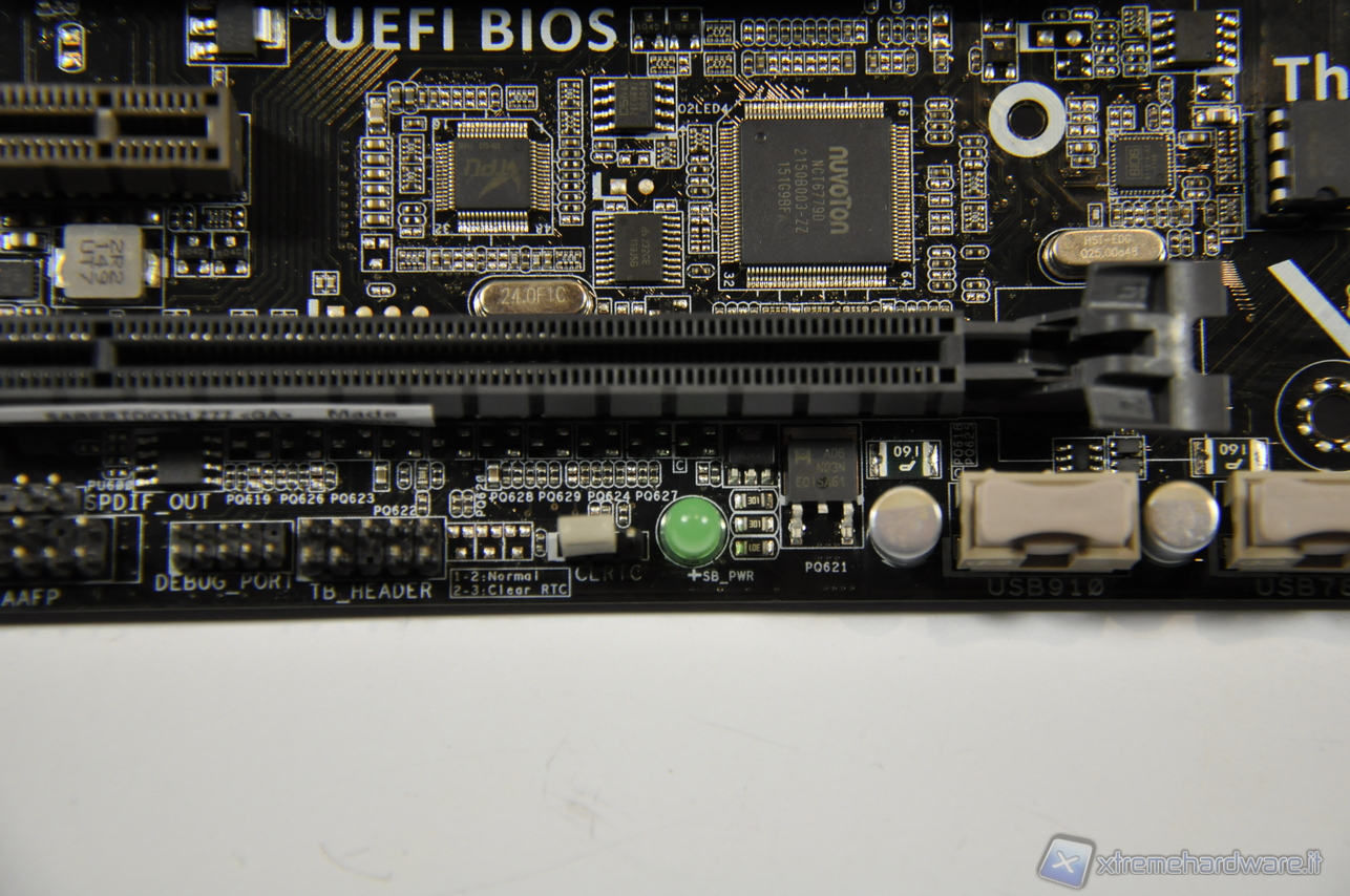La base come da prassi ospita i numerosi connettori tra cui s’intravede il chip Nuvoton NCT67790 che provvede a monitorare temperatura, voltaggi, velocità delle ventole, etc.