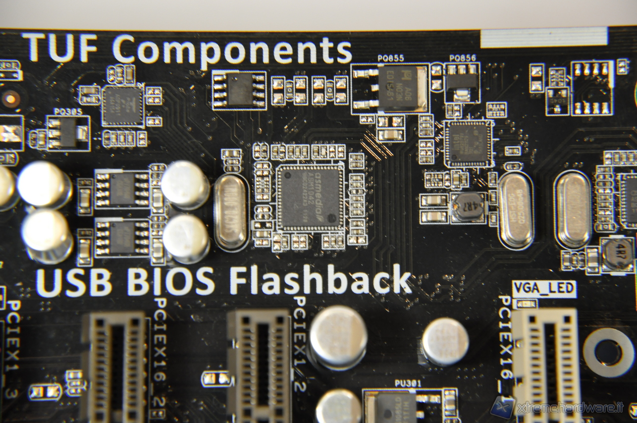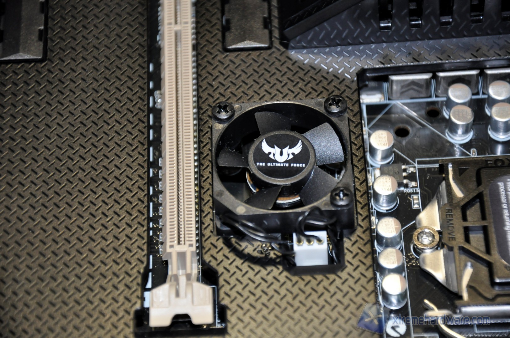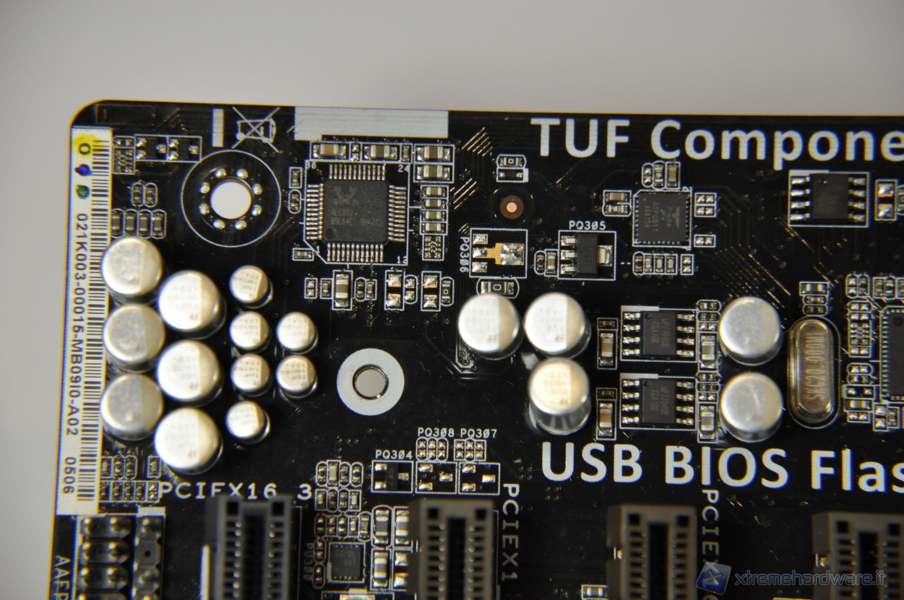 Come si può notare la scheda è lo stesso ricca di diciture ed informazioni serigrafate sul PCB. Si nota la tecnologia ad Heat-Pipe che unisce le due flange dissipatrici atte a raffreddare il sistema multifase a controllo digitale TUF ENGINE 8 + 4 + 2 composto da MOSFET di derivazione militare.