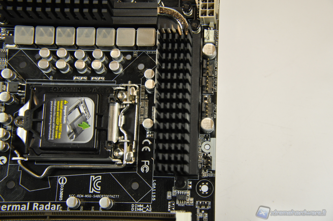 Benché lo spazio attorno al socket sia abbastanza ampio, non possiamo non mettervi in guardia da eventuali incompatibilità con dissipatori di dimensioni particolarmente generose. Per il resto si riconosce la chiusura a mono-perno propria del socket 1155 e la qualità leggermente superiore del socket di fattura Foxconn.